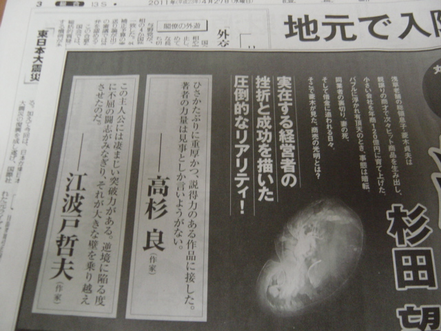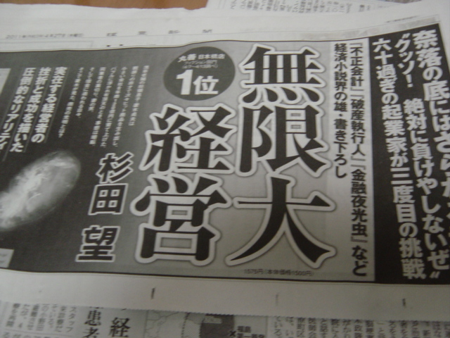 この前載せた経済小説の「無限大経営」丸善・日本橋店4月13までの調べで1位を記録しているようです